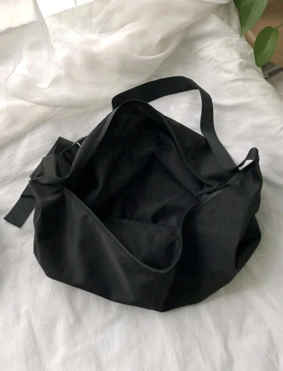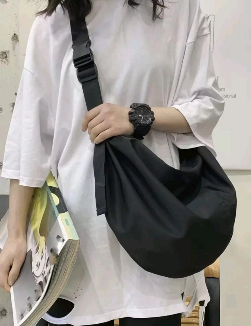 This black crescent-shaped crossbody bag is crafted from lightweight yet durable fabric, designed for maximum practicality. Featuring an adjustable wide shoulder strap and spacious interior, it’s perfect for school, casual outings, or light travel. Its unisex design and minimalist look make it a versatile go-to for anyone on the move.