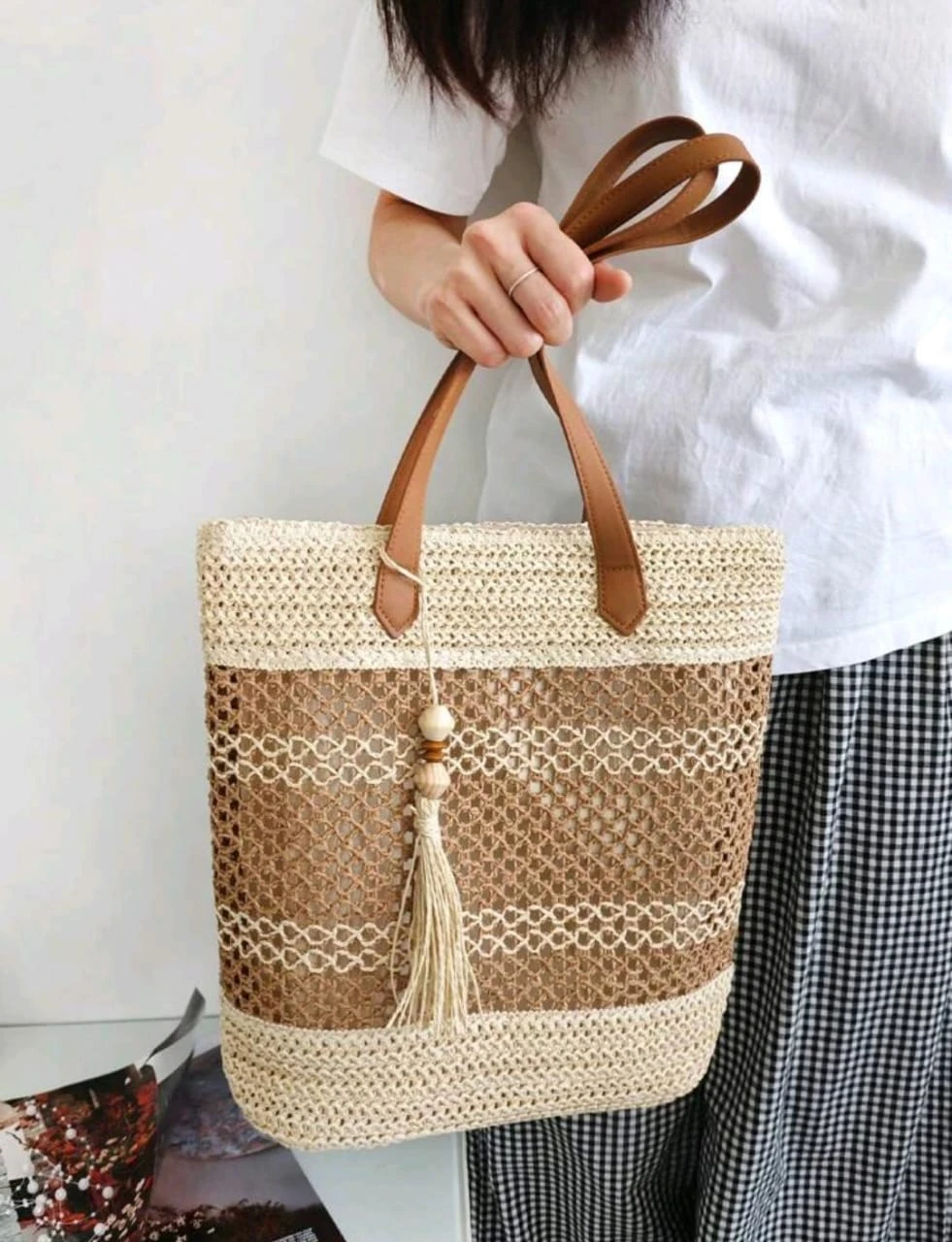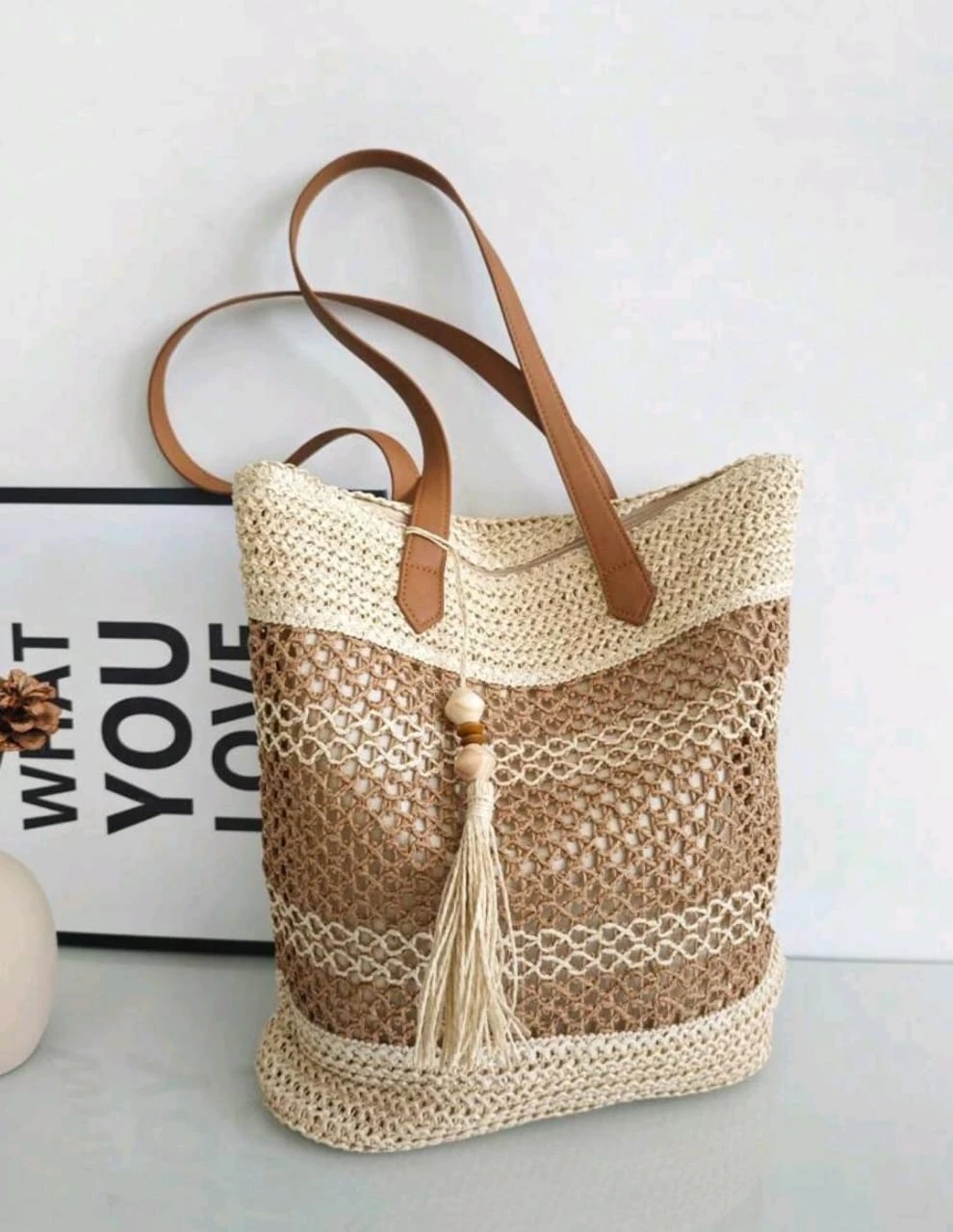 This boho-style straw tote features a unique woven mesh design in beige and brown tones. Accented with a long decorative tassel and wooden bead detail, it captures the relaxed charm of summer. The brown faux leather straps add a structured finish while maintaining the overall soft, handcrafted feel.