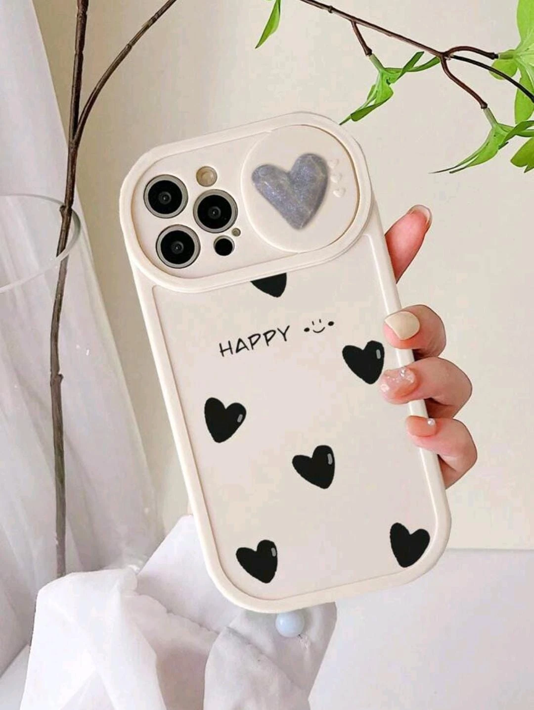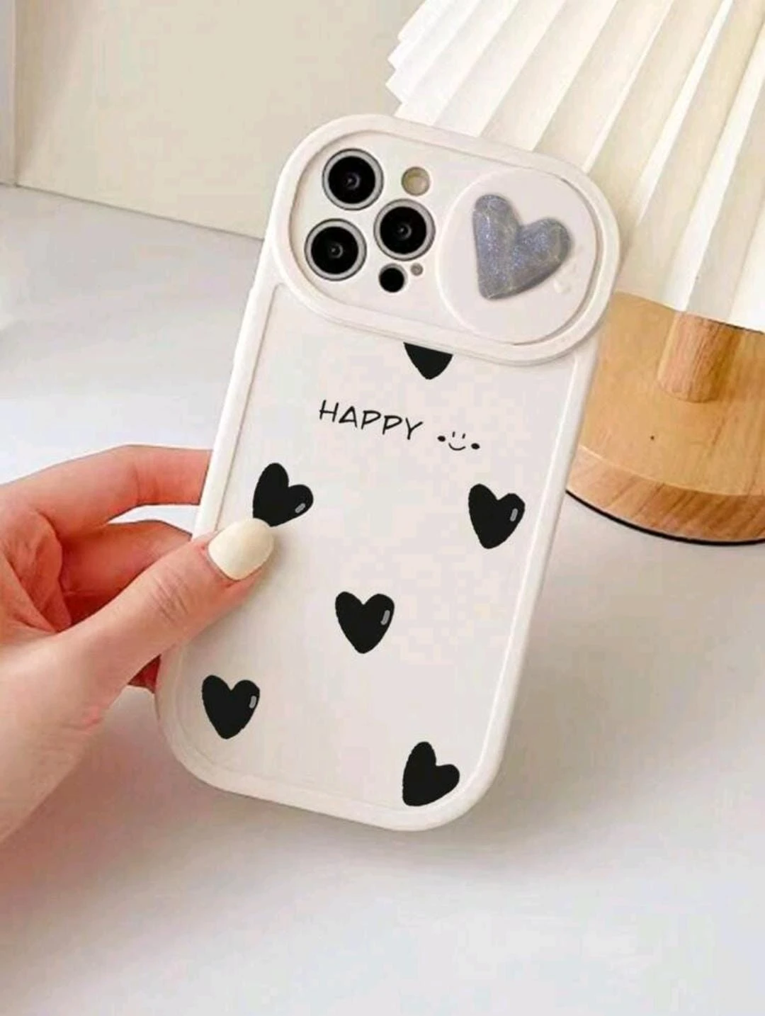 Cute phone case with black hearts and "Happy" text