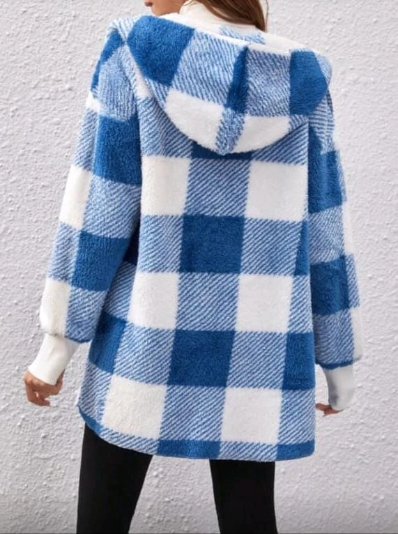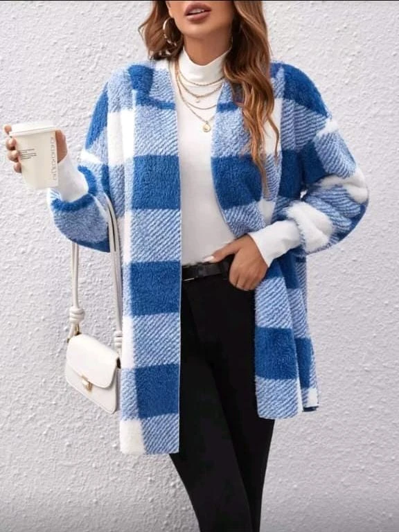Stylish winter cardigan with a bold blue and white checkered pattern. Open-front design with no buttons for a modern, cozy look. Made from soft, fuzzy fabric perfect for keeping warm on chilly days. Easy to pair with jeans or plain trousers for a trendy casual outfit. Great for daily outings and quick errands.