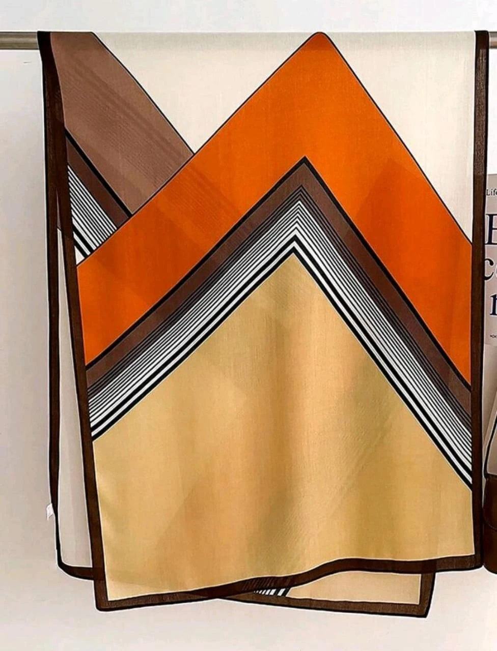 Crafted from smooth, glossy fabric, it features a geometric print in warm, earthy tones like burnt orange, beige, and cream.