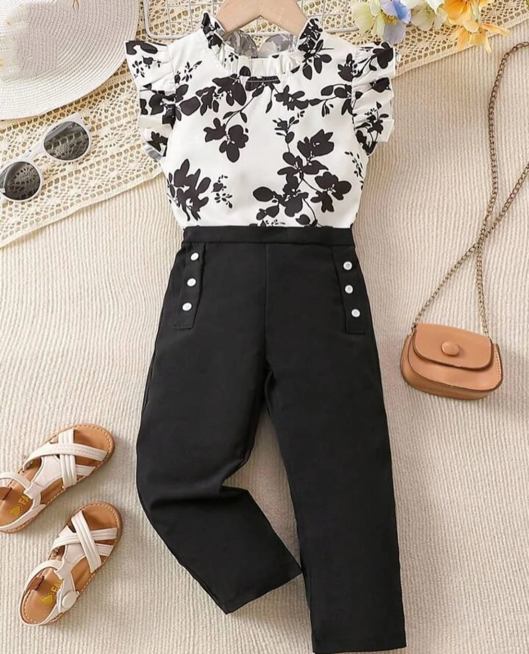 The white top features bold black floral prints and ruffled sleeves, while the high-waist black pants add a timeless touch.