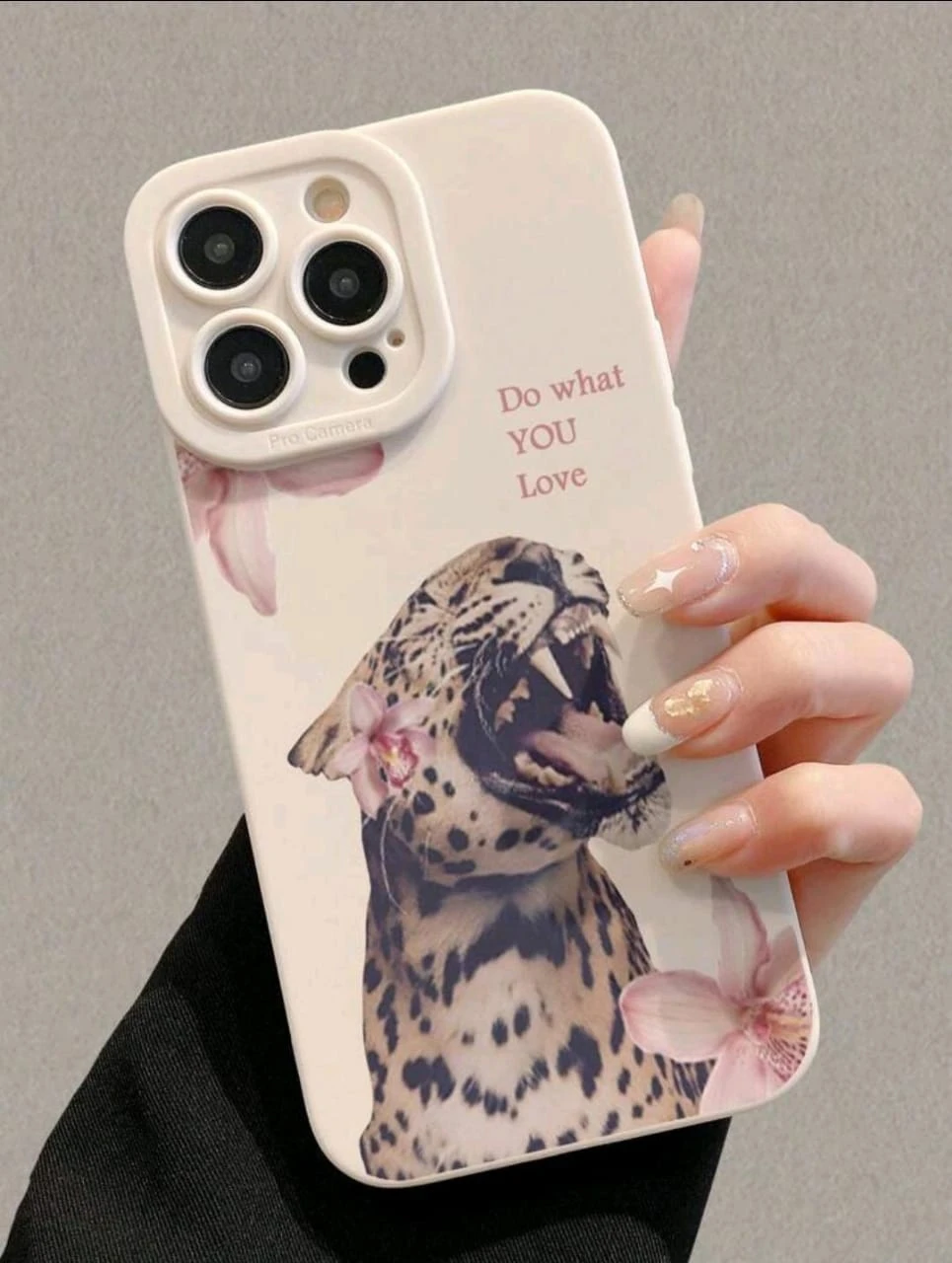 Stylish white phone case with a bold leopard print & delicate floral accents