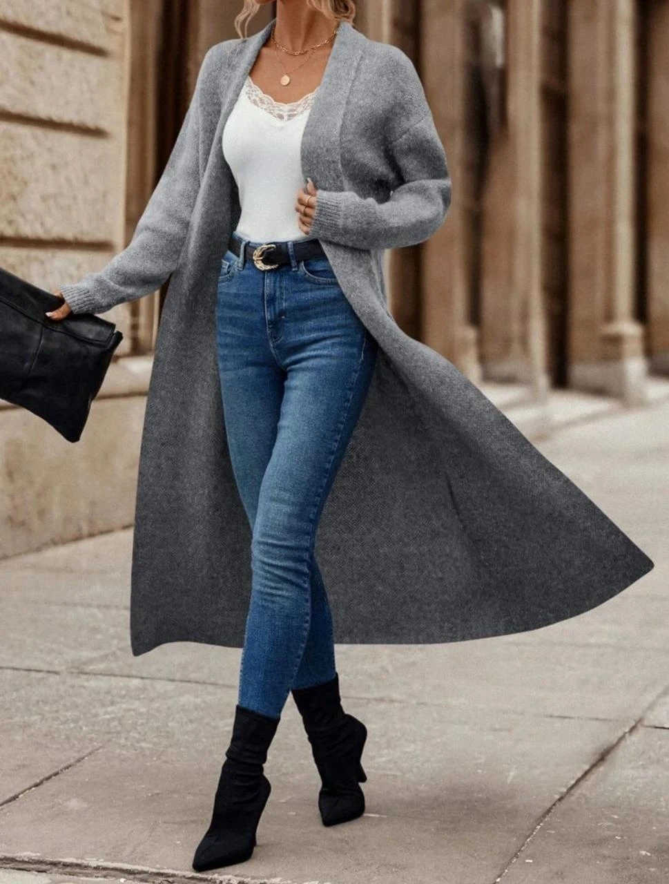 Add elegance and warmth to your look with this classic long open-front cardigan