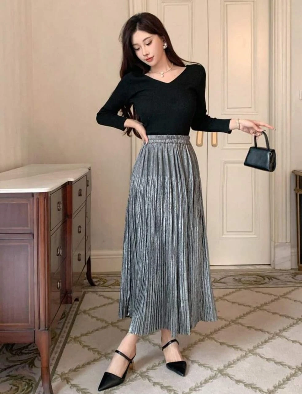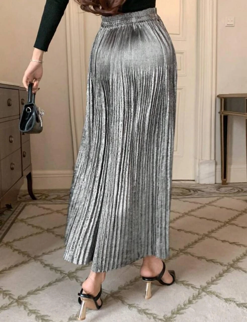 This metallic pleated midi skirt adds effortless elegance to any outfit.