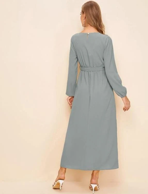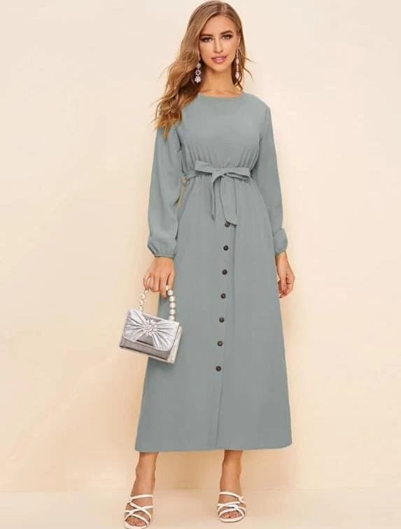 This modest grey midi dress is the definition of quiet elegance. Featuring a solid tone with a buttoned front detail (decorative), it comes with a matching waist tie to flatter the silhouette. The long sleeves with gathered cuffs make it perfect for cooler seasons or modest dressing. Suitable for workwear, everyday outings, or casual events.