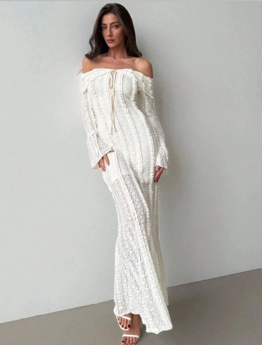 This off-shoulder lace maxi dress is made to turn heads with its effortlessly elegant silhouette.