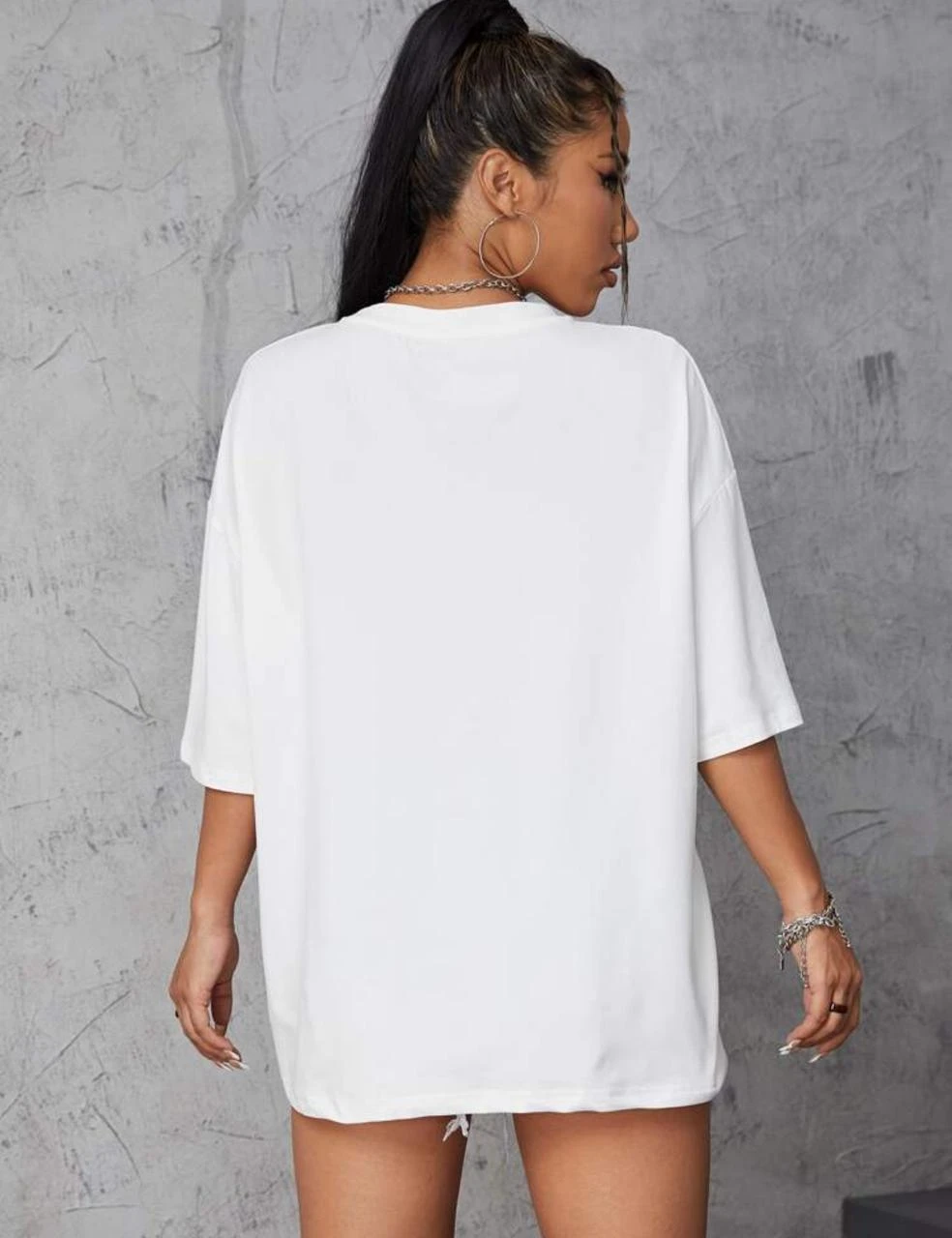 Step into the sunny mood with this oversized white tee featuring colorful cartoon beach girls and “California – Beach Weekend 2022” text.