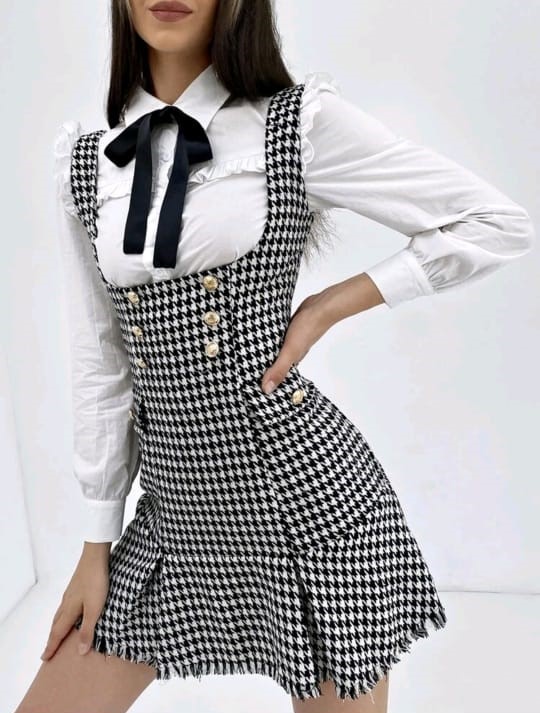 Stand out with a refined and fashionable look featuring a plaid mini skirt with gold button details and sleek pocket styling, paired with a white shirt designed with soft ruffle accents along the collar and long sleeves