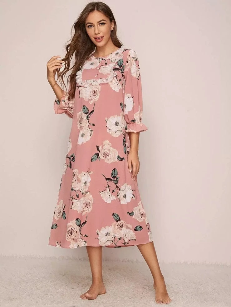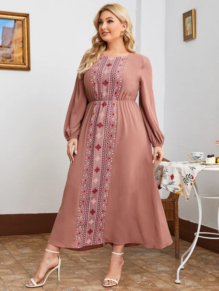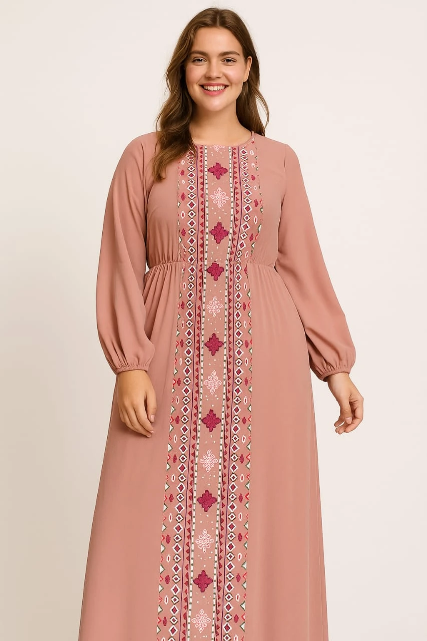 This charming midi dress is designed for comfort and elegance, featuring a soft pink color and vertical folk-style embroidery down the front. The relaxed fit and long puff sleeves provide a flattering silhouette for plus-size figures. Ideal for modest dressing, casual outings, or traditional gatherings.