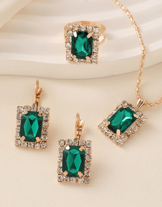 This luxurious jewelry set includes a necklace, earrings, and an adjustable ring – all designed with a striking emerald green gemstone at the center, framed by sparkling crystals. The gold-tone finish adds a glamorous vibe, making it a perfect pick for weddings, parties, or elegant evening looks. Specifications: ✔️ Material: Gold-plated alloy + crystal stones ✔️ Design: Rectangular green gem framed with rhinestones ✔️ Key features: Elegant – sparkling – royal feel ✔️ Practical benefits: Ideal for special occasions – perfect gift idea