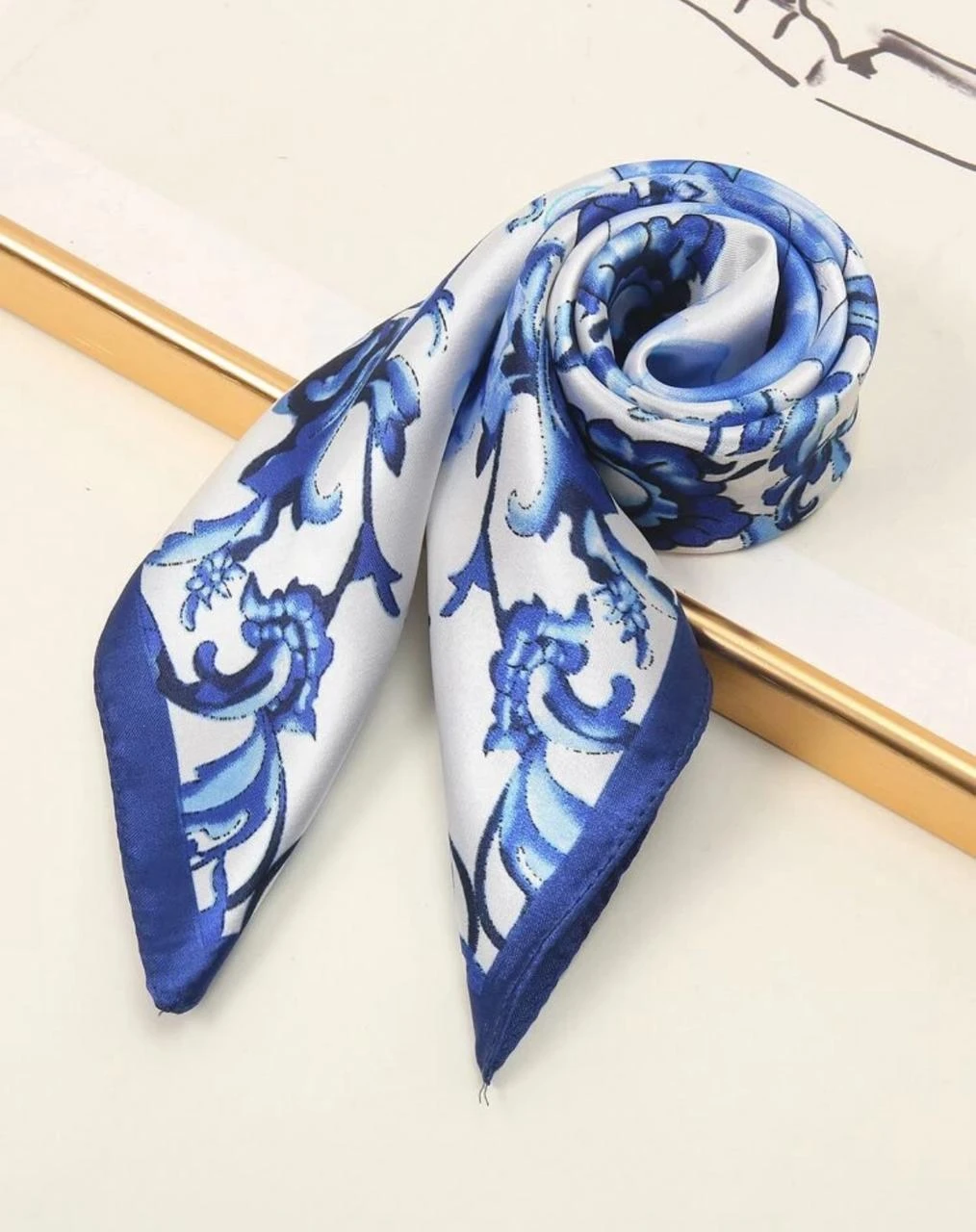 A stylish square satin scarf featuring a blue floral print over a soft white background.