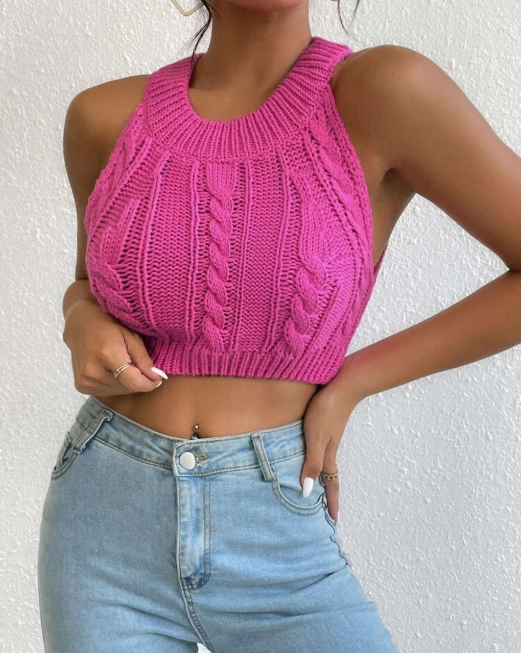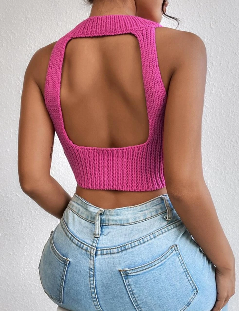 A bold and stylish sleeveless crochet knit top in eye-catching hot pink.